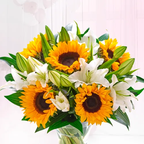 • Стандарт - роза - 3 шт., кустовая роза - 1 шт., подсолнух - 1 шт., зелень, упаковка, лента