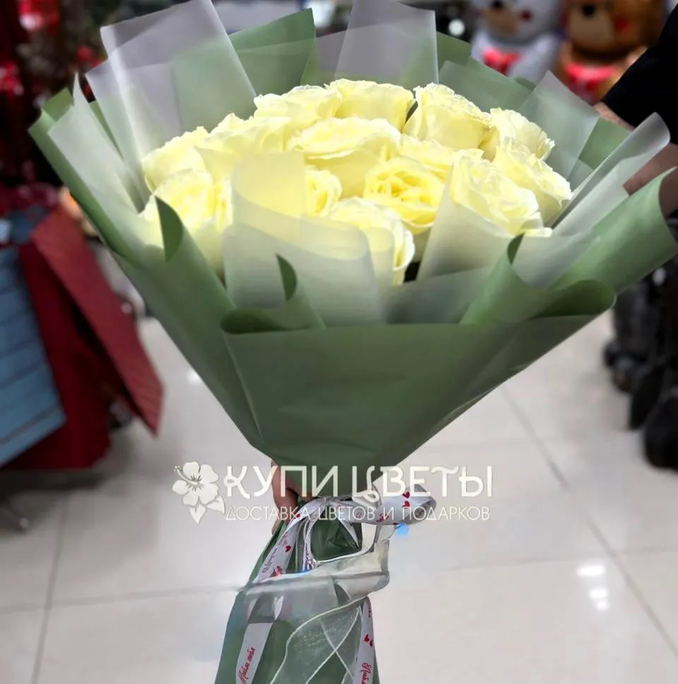 15 белых роз, упаковка, лента