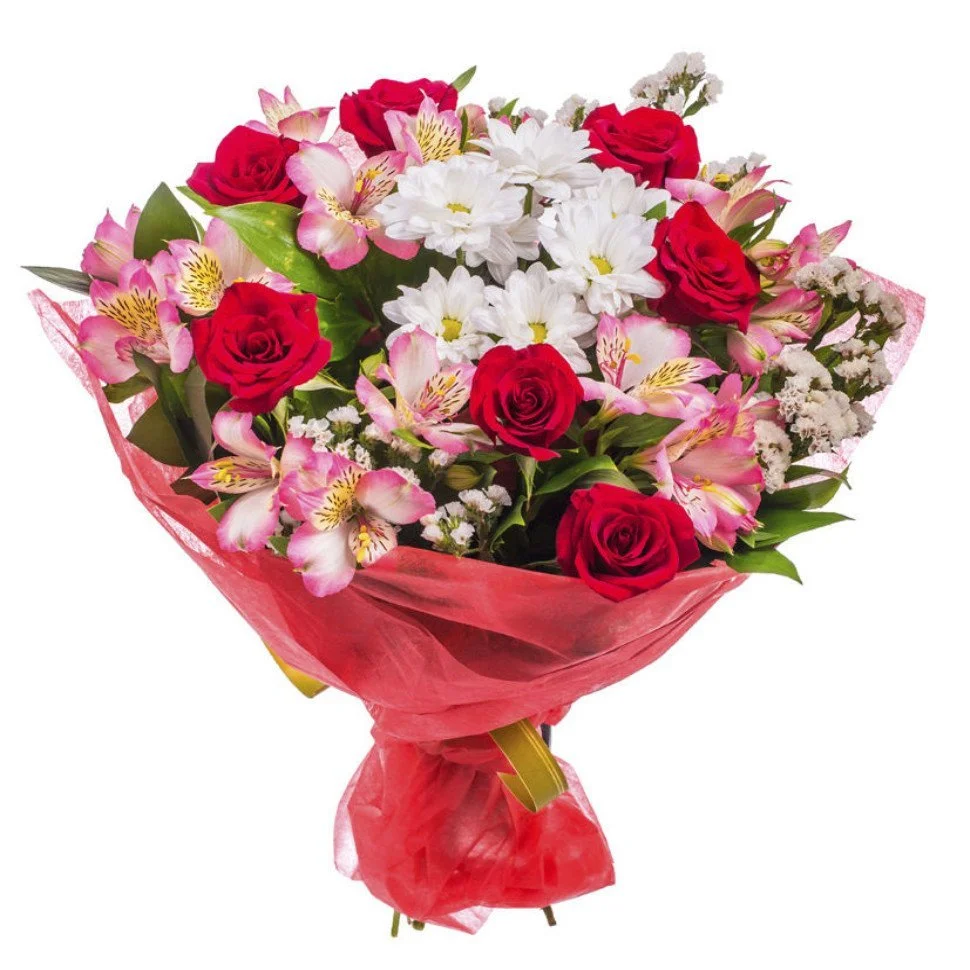 Вариант—Стандарт - роза - 3 шт., альстромерия - 4 шт., хризантема - 1 шт., зелень, упаковка, лента