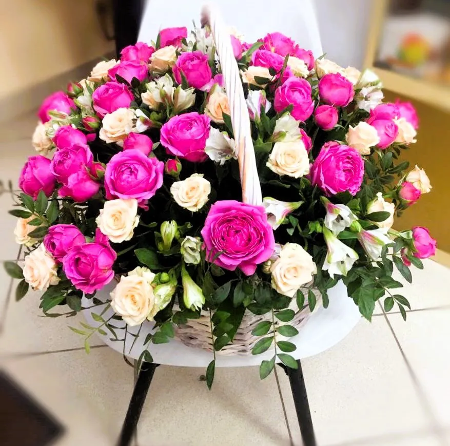 Состав: кустовые розы, альстромерии, зелень, оазис ,корзина