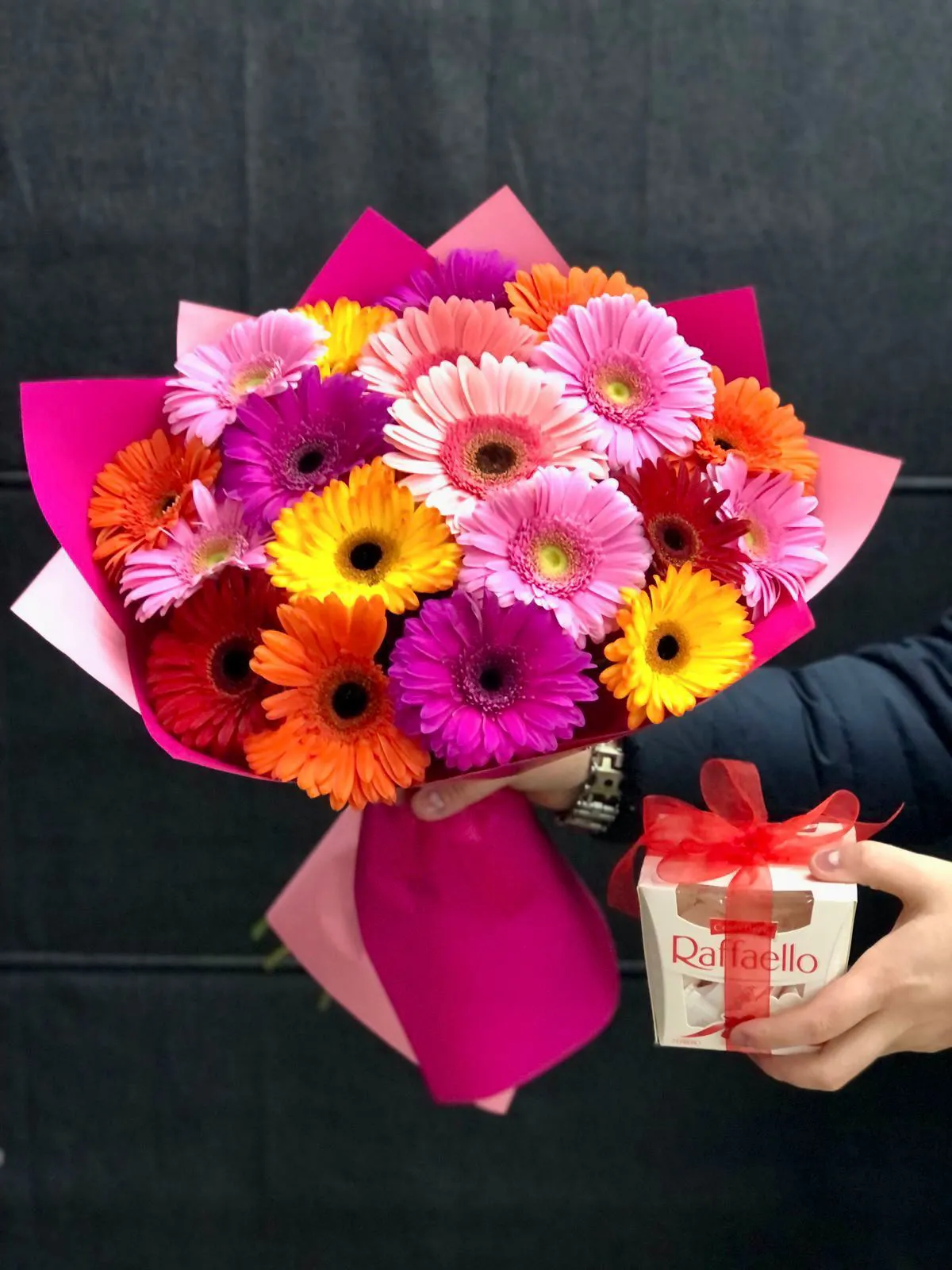 • Средний ( гербера - 9 шт., упаковка, лента + рафаэлло)
