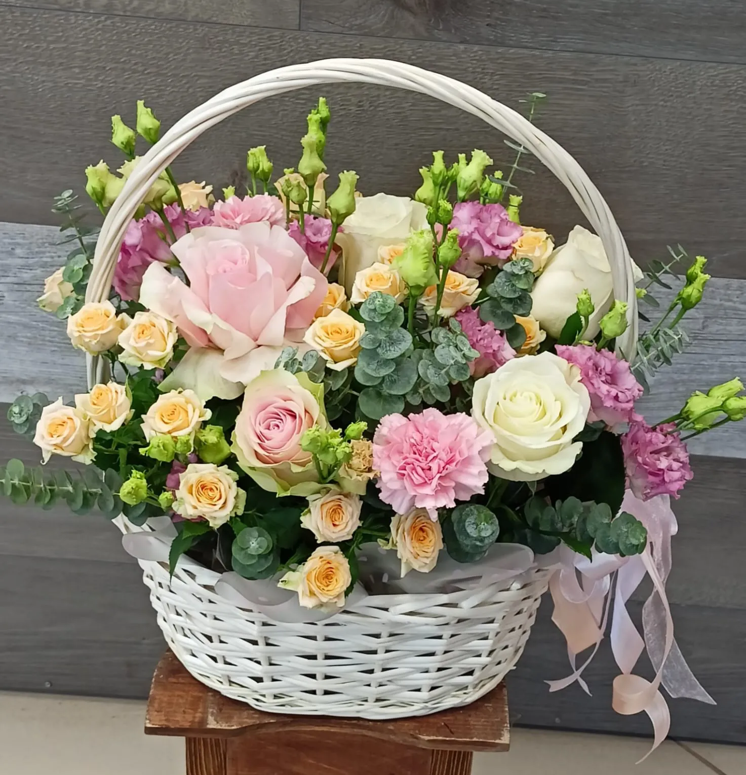 Корзина из роз и эустомы Иль-де-Франс