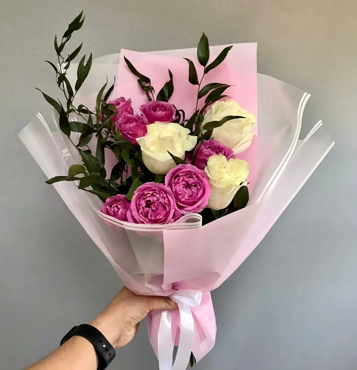 Букет из кустовых розовых роз в сочетании с одноголовыми белыми – это хороший подарок при первом свидании, для того чтобы произвести впечатление на девушку.   Однако, вы можете преподнести его и по случаю какого-то праздника или просто как комплимент.