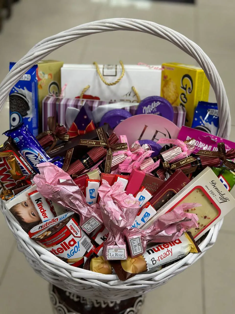 Состав: печенье Оrео, kinder, конфеты Коркунов, конфеты Milka, конфеты, шоколадки, печенье, nutella шоколад и паста.