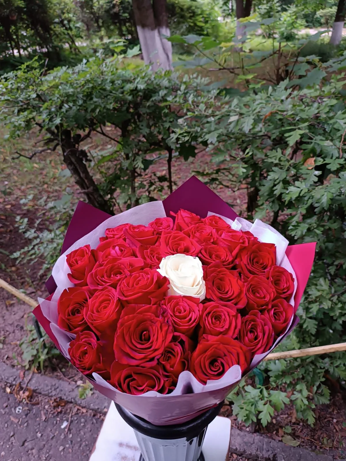 • Средний - 25 роз, упаковка, лента