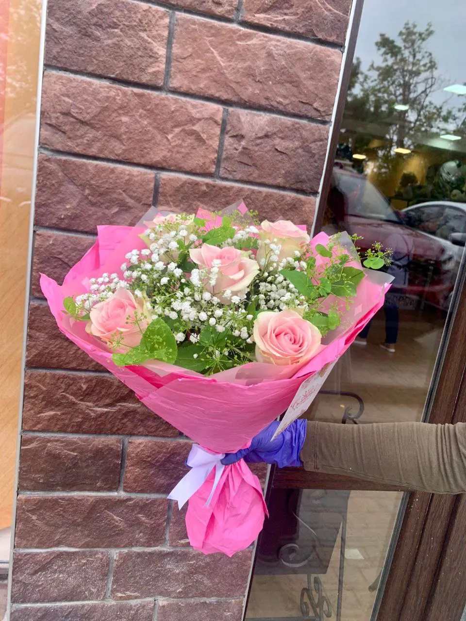 Вариант—Мини - роза - 5 шт., гипсофила, упаковка, лента