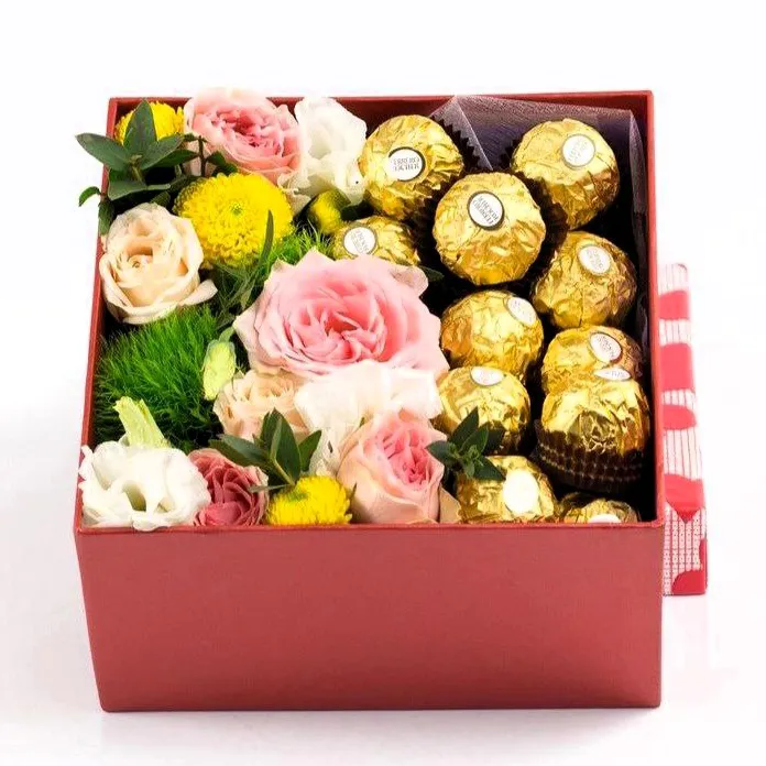 Шляпная коробка с Ferrero Rocher и цветам — идеальное сочетание элегантности и ароматного удовольствия!  Создайте незабываемые моменты, наполнив их сладкими радостями и яркими эмоциями.