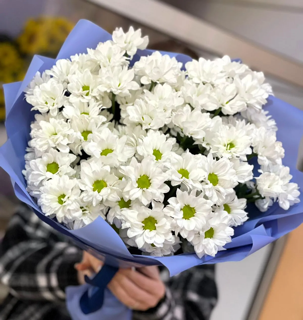 Замечательный букет из белых ромашковых хризантем в элегантной синей упаковке – это истинное воплощение нежности и свежести. Каждая хризантема, словно маленькое солнце, светит своей белизной и простотой, создавая атмосферу легкости и радости. Синяя упаковка, как спокойное море, подчеркивает красоту цветов и добавляет изысканности.