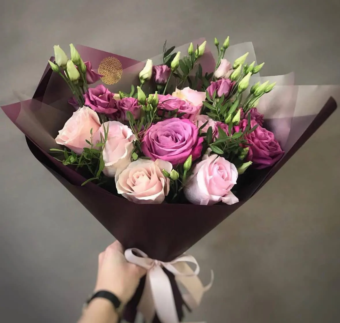 розы, лизиантусы, зелень, упаковка, лента.