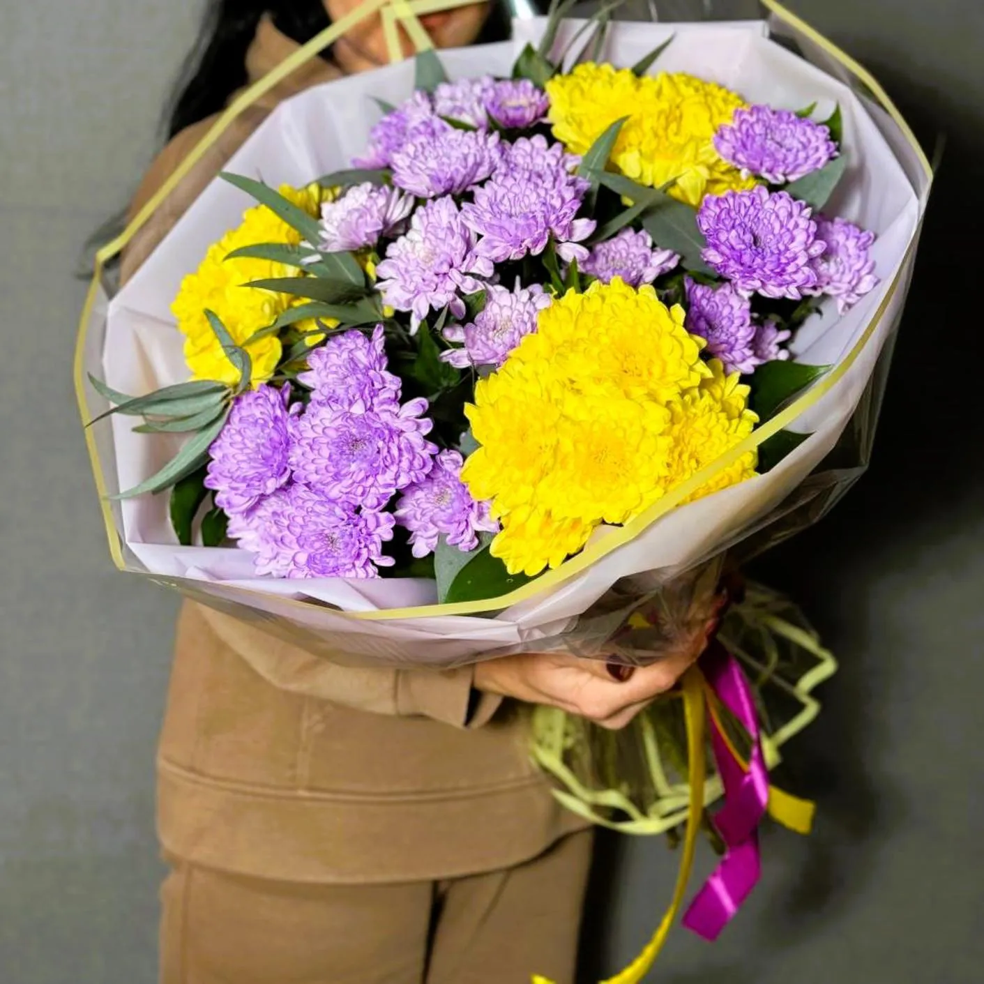 Такой букет не только привлекает внимание, но и создает удивительное настроение. Желтые хризантемы дарят тепло и солнечный свет, а фиолетовые создают атмосферу спокойствия и гармонии. Это отличный выбор для подарка на день рождения, юбилей или просто как знак внимания близким.