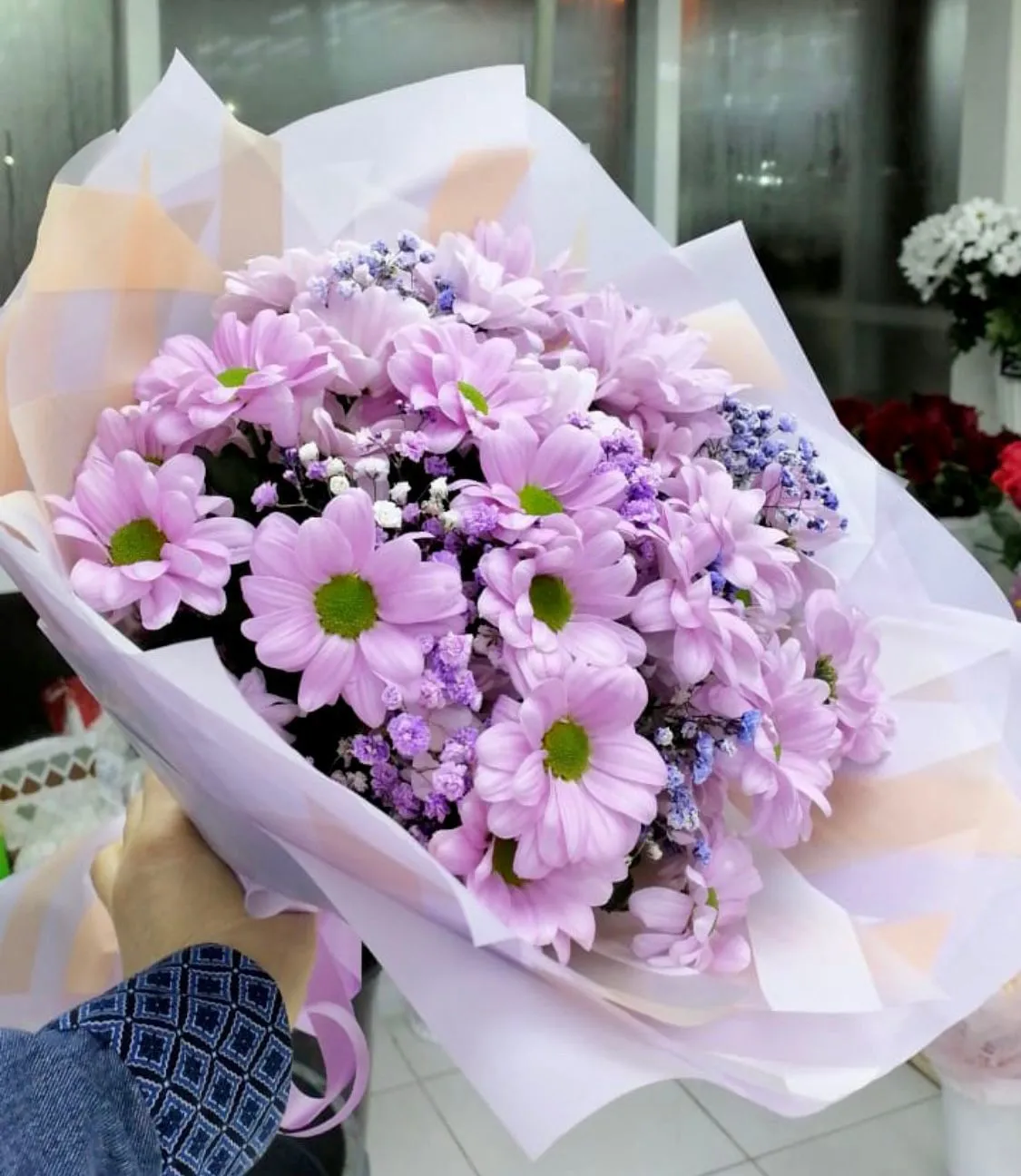 кустовая хризантема , гипсофила , упаковка, лента
