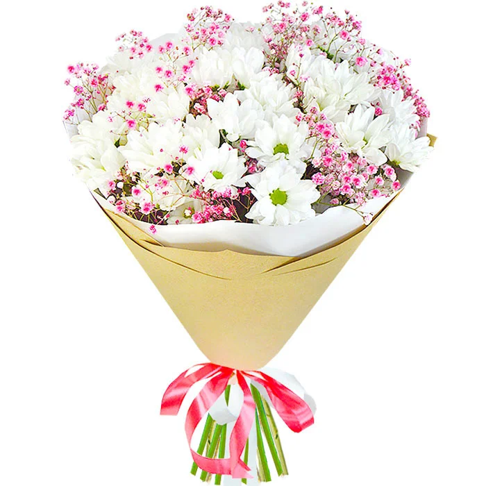 кустовая хризантема , гипсофила , упаковка, лента